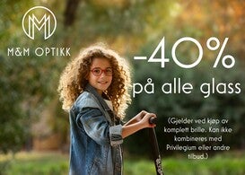 40% på glass i hele oktober. Tilbudet gjelder ved kjøp av komplett brille, dvs både innfatning og glass. Tilbudet kan ikke kombineres med andre tilbud.